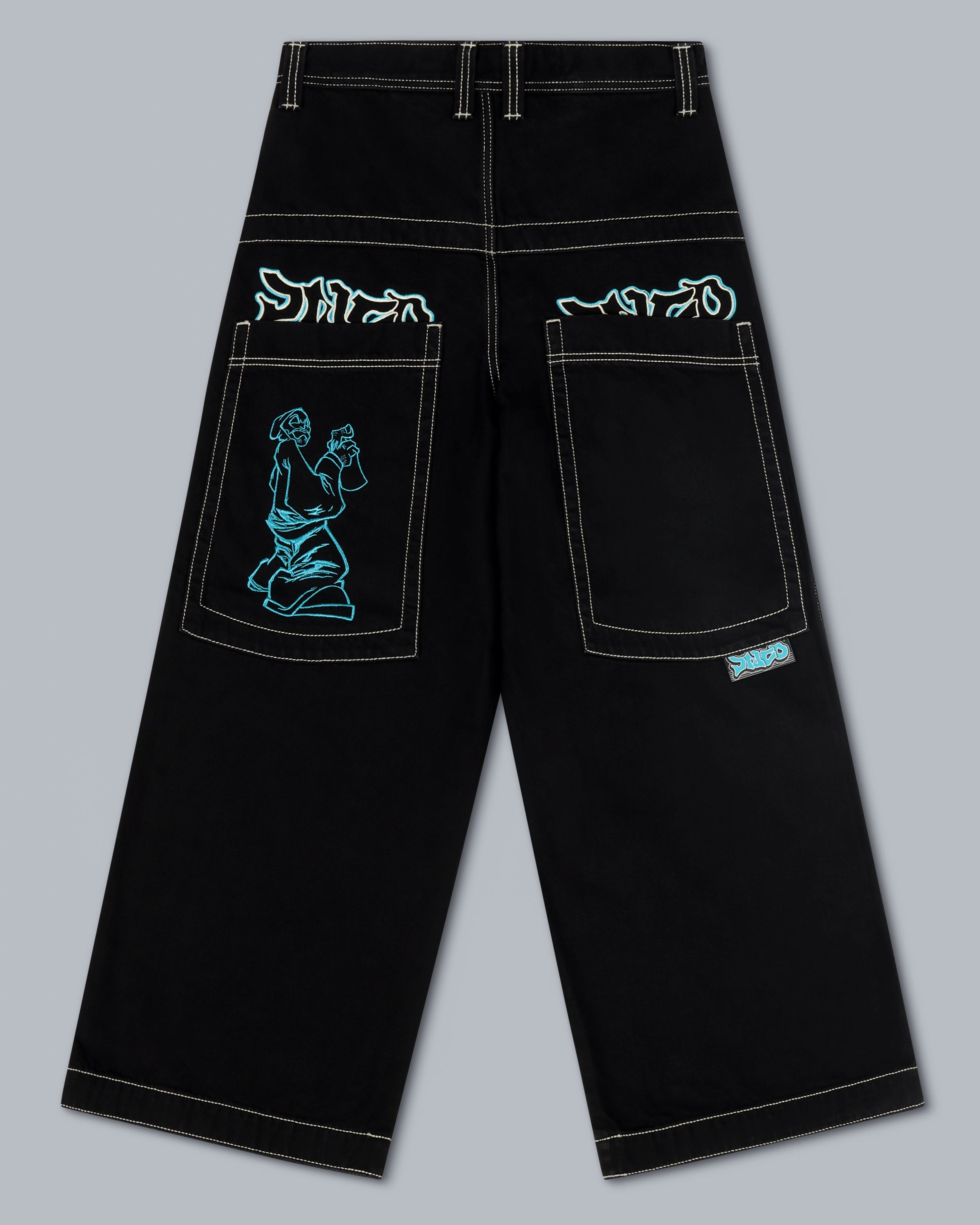 Collector’s item from the original JNCO “Roots” collection. Jet Black denim, 26" bottom opening. 13oz 100% cotton rope-dyed with luxe starch wax finish. Heavy contrast stitching with dual JNCO logos over back pockets and metallic “tagger” embroidery. Original labels and collectible metallic flasher. Limited Edition – very limited stock.