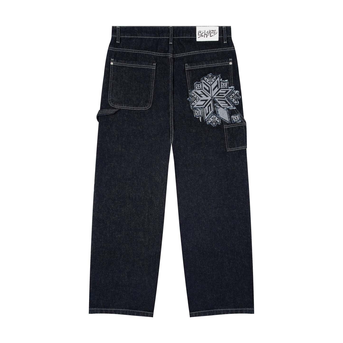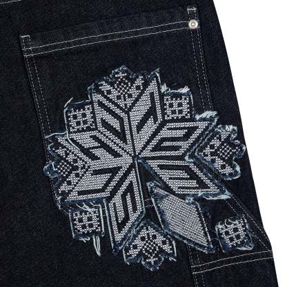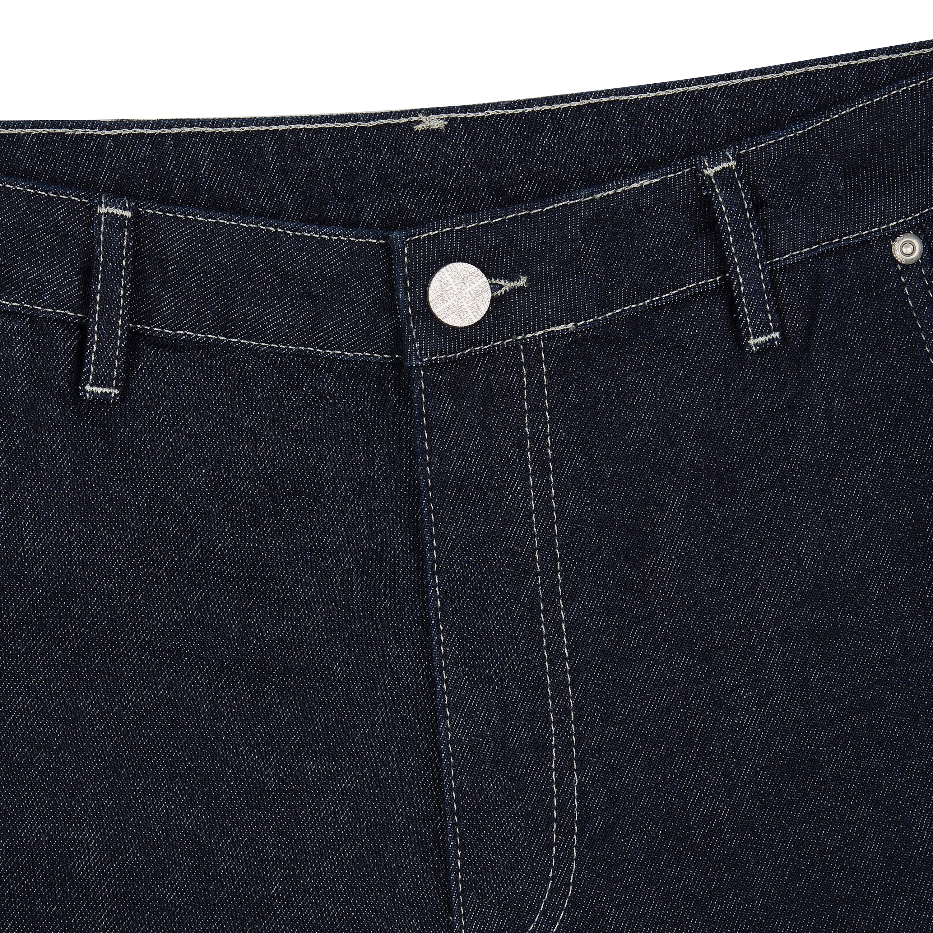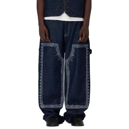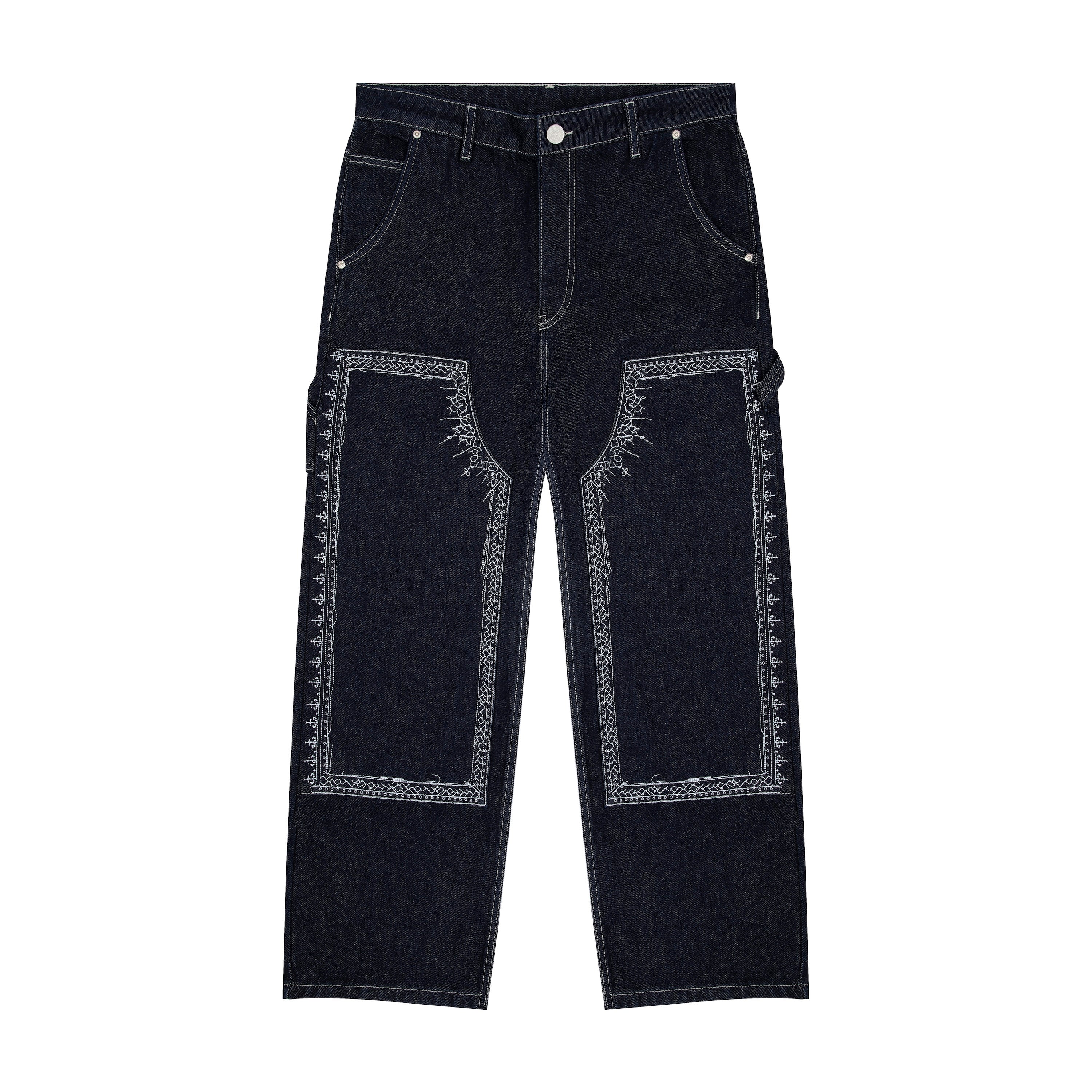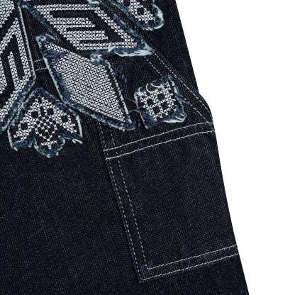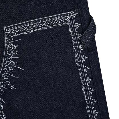 14,5oz denim / 100% cotton / embroidery on front panels and back pocket / embroidered leather patch / custom button / wash inside out / fits true to size