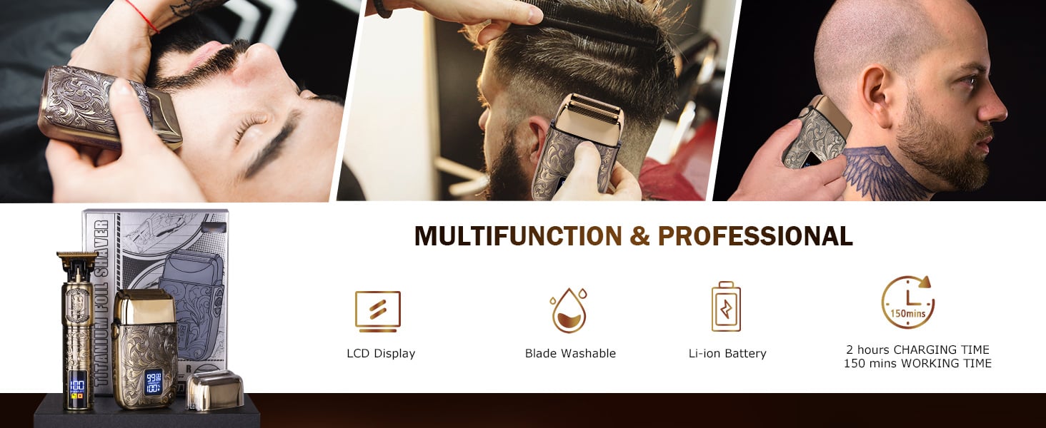 TYTANIOWE OSTRZE T I PODWÓJNE FOLIOWE OSTRZE – Dzięki wyściółce w kształcie litery T i konstrukcji profesjonalnej golarki maszynka może osiągnąć zerowe cięcia, wyściółkę i krawędziówkę. Golarka jest hipoalergiczna i delikatna dla skóry, dzięki czemu nadaje się dla osób w każdym wieku.