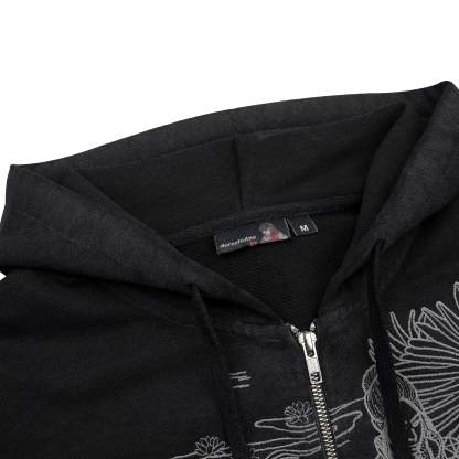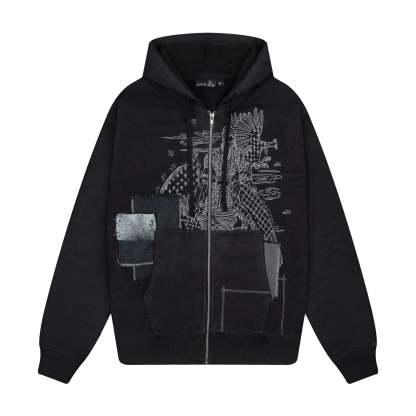 480gsm french terry/ 100% preshrunk cotton/ YKK zipper/ flatlock stitching/ embroidery and denim patchwork on front / fits true to size
