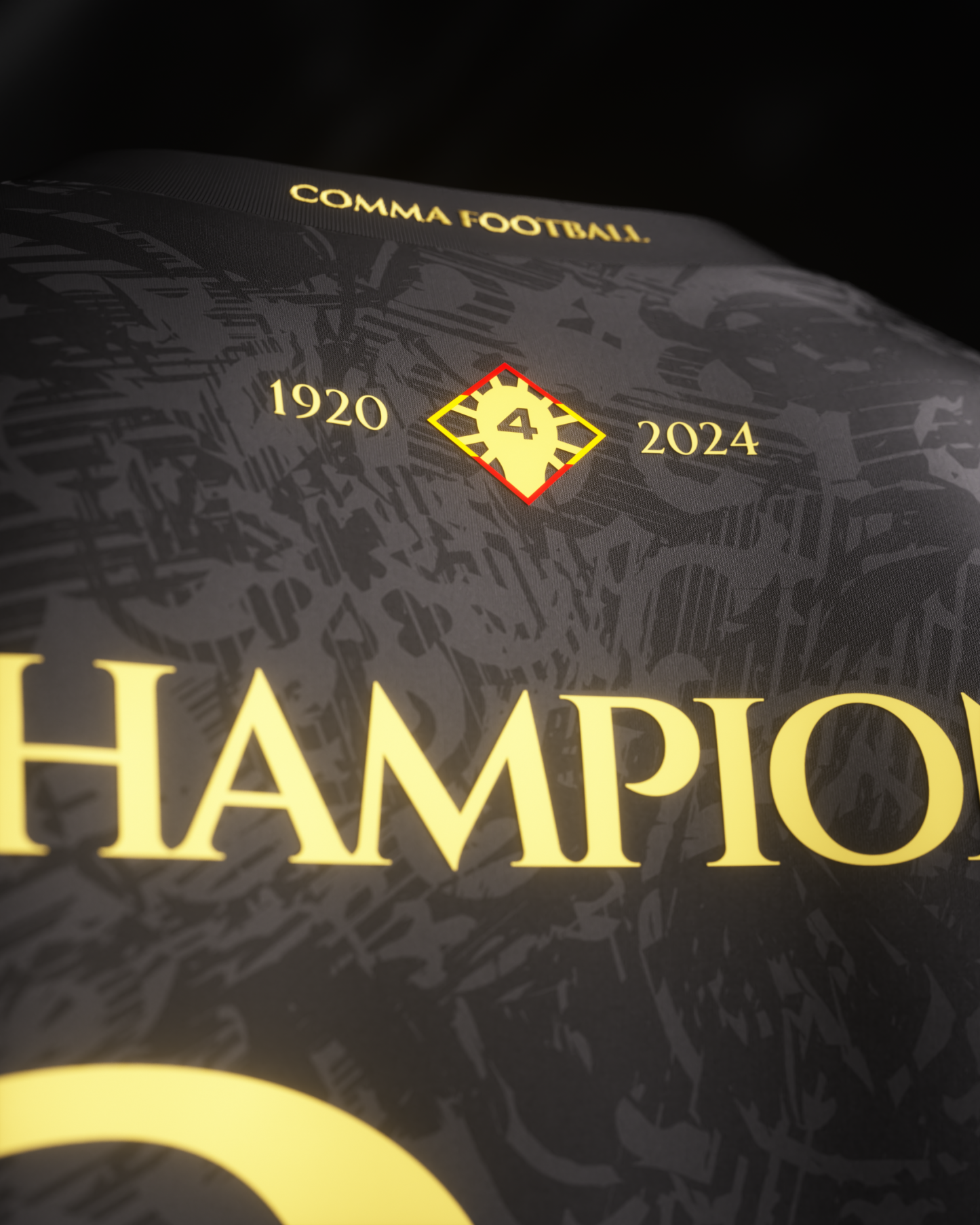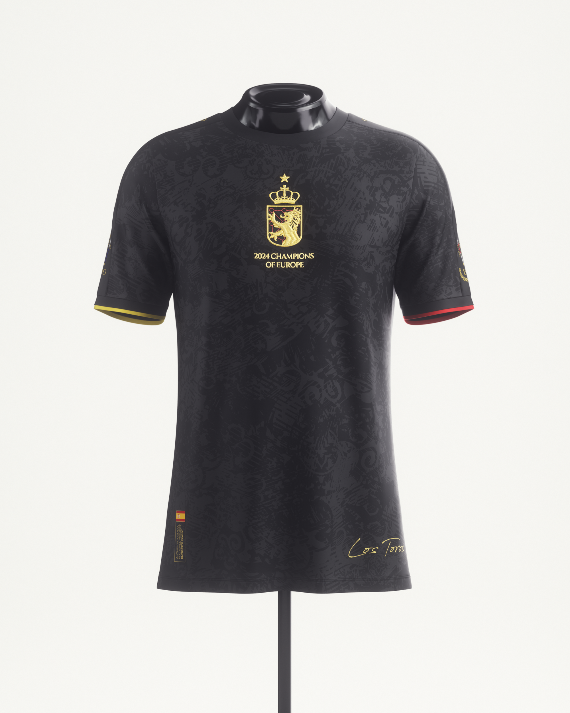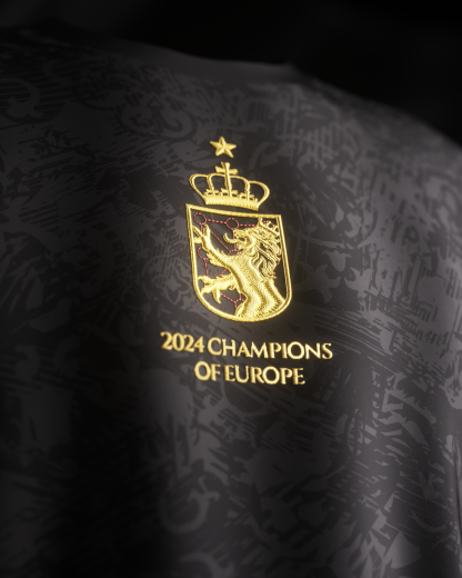 A black and gold jersey with a bull-inspired pattern. Featuring every win of the tournament embroidered along the right and left sleeves, embroidered gold detailing, and back details for their potential 4th European Championship win.