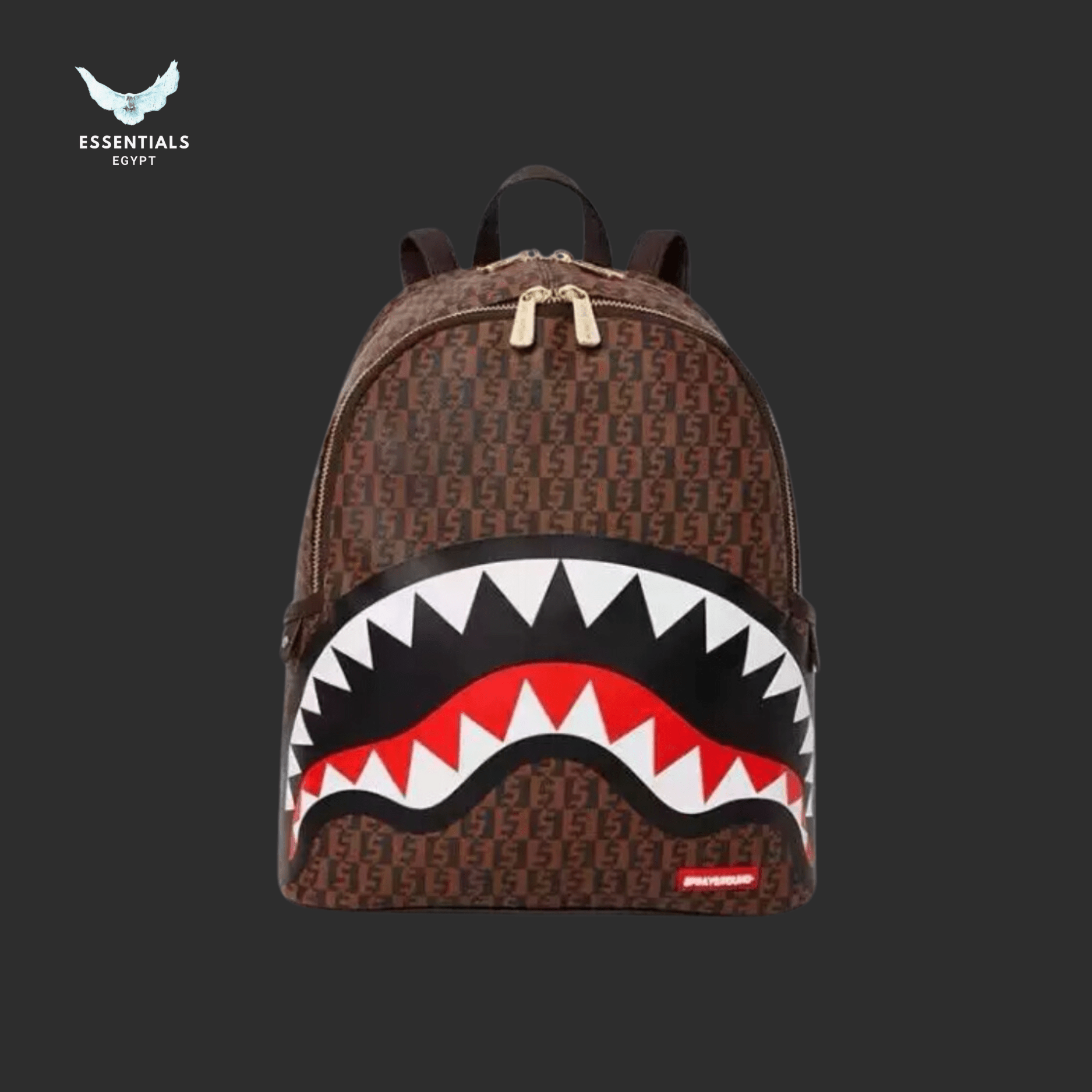 Dark brown monogrammed design with bold shark mouth. Statement Sprayground piece. Dimensions: 25.4 cm x 12.7 cm x 29.2 cm.