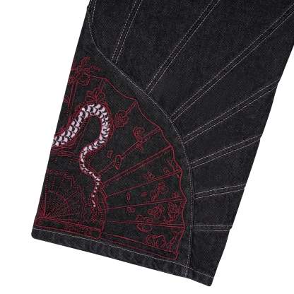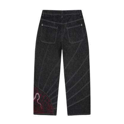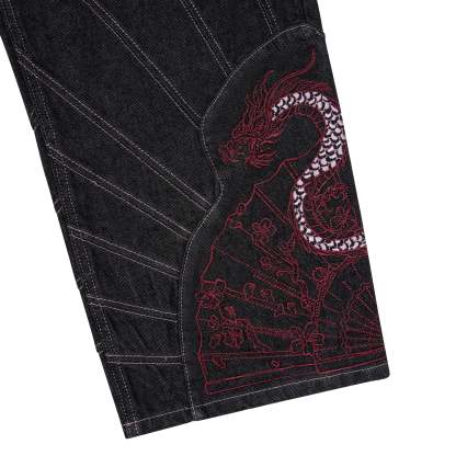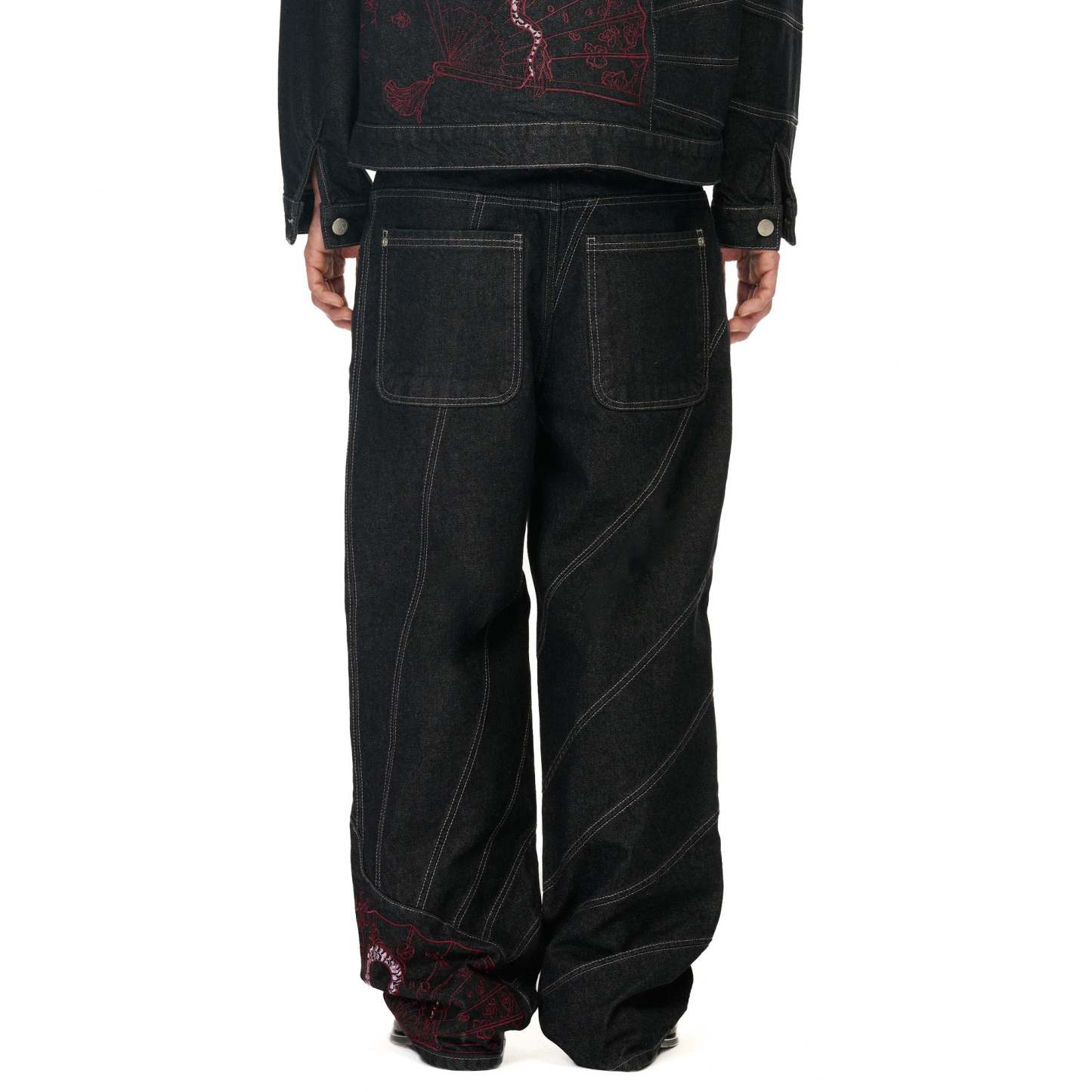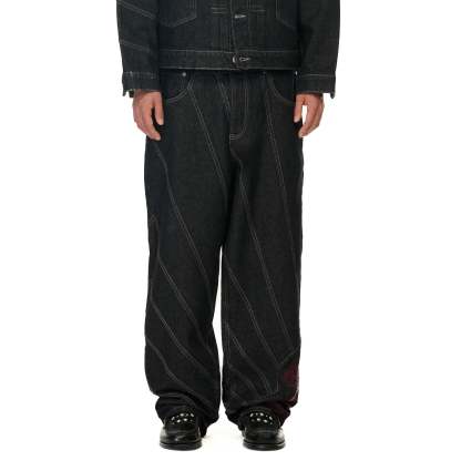 14,5oz raw denim / 100% cotton / fan-cut / embroidery on front back / wash inside out / straight fit / fits true to size